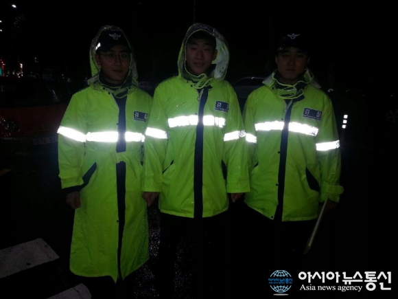 지난 7일 오후 10시쯤 술에 취해 길을 잃고 방황하던 70대 어른을 안전하게 귀가하도록 도와 준 착한 남동경찰서 방범순찰대 왼쪽부터 박찬영 상경, 김채환 상경, 지선호 이경 모습./아시아뉴스통신=이명기 기자 지난 7일 오후 10시쯤 하루종일 가을비가 ... 2015-11-12