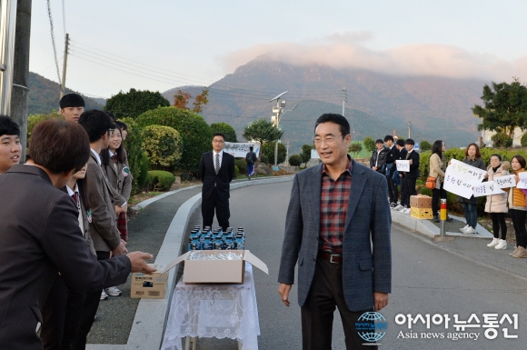 12일 오전 박영일 경남 남해군수가 ‘2016학년도 대학수학능력시험’이 치러지는 남해제일고와 남해고를 찾아 수험생을 응원하고 있는 후배들을 격려하고 있다.(사진제공=남해군청) 박영일 경남 남해군수가 12일 관내 ‘2016학년도 대학수학능... 2015-11-12