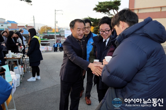 12일 오전 2016학년도 대학수학능력시험이 전국에서 일제히 실시됨에 따라 경기 안성시 간부공무원들이 관내 수능시험장을 방문해 수험생들을 격려했다.(사진 왼쪽 황은성 안성시장).(사진제공=안성시청) 2016학년도 대학수학능력시험이 12일 오전 전국... 2015-11-12