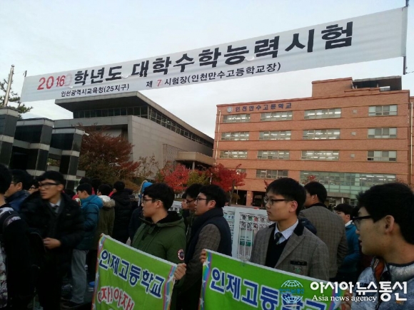 12일 오전 2016학년도 대학수학능력시험이 전국에서 동시에 일제히 시작된 가운데 제7시험장인 인천 남동구 만수고등학교에서 인제고등학교 후배 학생들이 선배들을 응원하며 격려하고 있다./아시아뉴스통신=이명기 기자 2016학년도 대학수학능력시... 2015-11-12