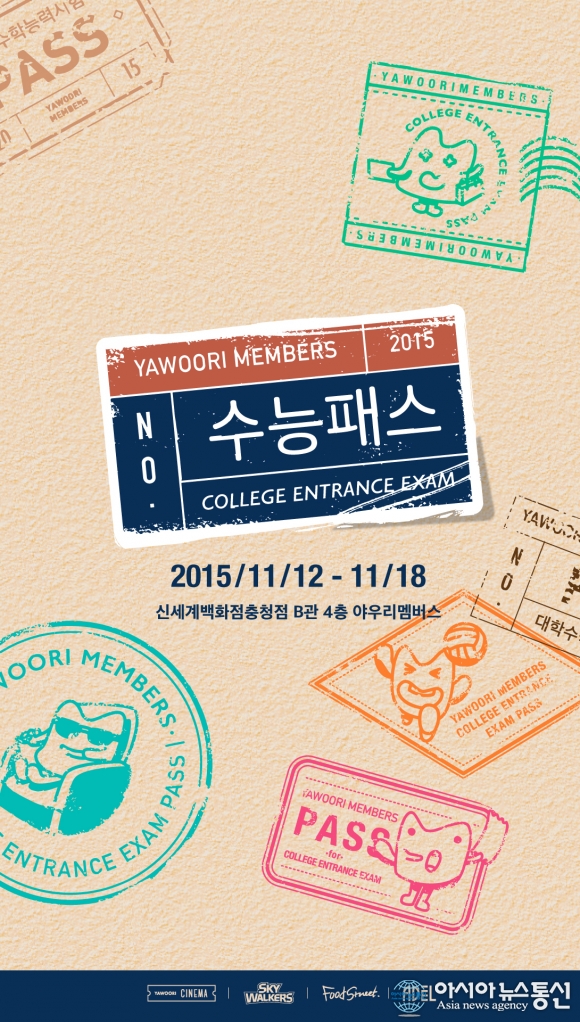 충남 천안 야우리멤버스 '수능패스' 행사 홍보문.(사진제공=(주)아라리오) 충남 천안 야우리멤버스가 오는 18일까지 일주일 동안 수험생들을 위한 다양한 행사를 펼친다. 야우리멤버스는 페이스북과 전화 예약 선착순 행사를 진행, 13일 '0... 2015-11-12