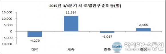 올해 3분기 충청권 인구 변화.(자료제공=충청지방통계청) 세종시가 정부부처 이전과 각종 편의 시설이 갖춰지면서 인근 도시로부터 유입 인구가 급격히 늘어나고 있는 것으로 나타났다. 12일 충청지방통계청이 발표한 올해 3분기 충청지역경제동향에... 2015-11-12
