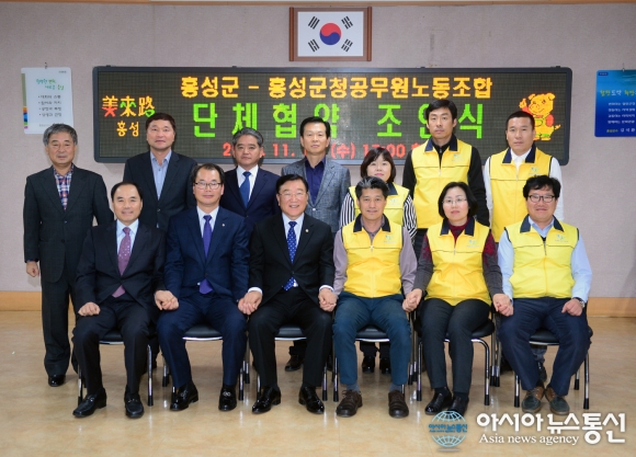 11일 홍성군청 회의실에서 군과 군공무원노동조합이 단체협약을 체결하고 사진촬영을 하고 있다.(사진제공=홍성군청) 충남 홍성군(군수 김석환)과 홍성군청공무원노동조합(위원장 이순광, 이하 홍성군노조)은 11일 군청 회의실에서 단체협약을 체결했... 2015-11-12