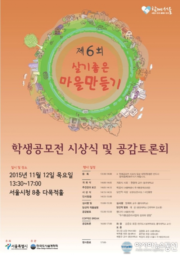 '제6회 살기좋은 마을만들기 학생공모전'포스터.(사진제공=서울시청) 서울시는 '제6회 살기좋은 마을만들기 학생공모전'수상작을 12일 오후 2시, 서울시청 신청사 8층 다목적홀에서 시상한다. 이번 공모전은 기존 단독(다세대)주택 등이 밀... 2015-11-12