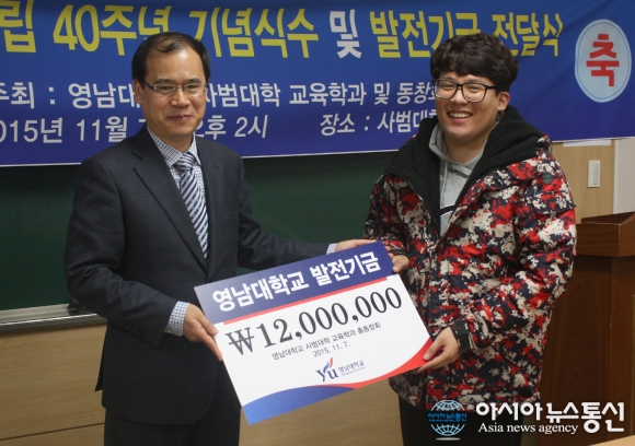 최근 영남대를 방문한 교육학과 동문 선배들이 후배사랑 장학기금 1200만원을 전달하고 있다. 왼쪽 이동기 영남대 교육학과 총동창회장.(사진제공=영남대) 영남대 사범대학 교육학과(학과장 정은) 동문 선배들이 후배사랑 장학금 1200만원을 기탁했다. ... 2015-11-12