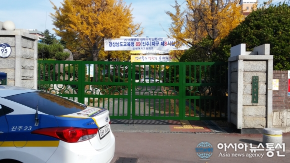 12일 오전 8시10분 '2016학년도 대학수학능력시험' 경남도교육청 89(진주)지구 제8시험장 입실을 완료하고 만일의 사태에 대비해 경찰 차량이 정문앞에서 비상 근무를 서고 있다. 사진은 경남 진주시 상평동 삼현여자고등학교 정문 모습./아시아뉴스통신=이재화 기... 2015-11-12