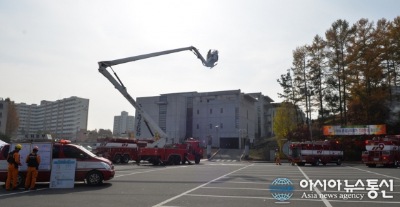 금산소방서는 11일 2015년 재난대비 긴급구조 종합훈련 실시했다.(사진제공=금산소방서) 금산소방서(서장 조영학)는 11일 금산읍 비호산(금산군향토관 광장)에서 2015년 긴급구조종합훈련을 실시했다. 재난상황 발생 시 신속한 상황전파, 대피유도 능... 2015-11-12