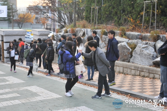 12일 대학수학능력시험 대전 제12시험장에서 한 교사가 입실하는 수험생에게 힘찬 하이파이브를 하며 격려의 말을 전하고 있다./아시아뉴스통신=박하늘 기자 2015-11-12