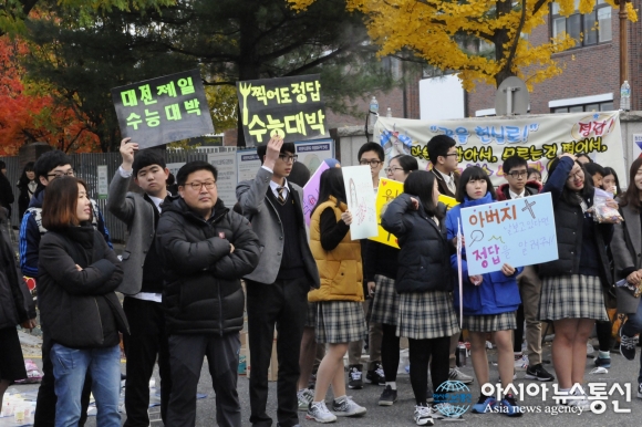 12일 대학수학능력평가 대전 제3시험장에서 이른 아침부터 응원차 나온 대전제일고등학교 교사 및 학생들이 다양한 응원팜플렛을 들고 수험생들을 기다리고 있다./아시아뉴스통신=이훈학 기자 2015-11-12