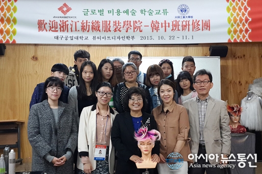 대구공업대학교를 방문한 중국 절강방직복장 직업기술학원의 미용예술 학술교류단 교사 및 학생들이 이별나 대구공업대 총장 등과 기념촬영을 하고 있는 모습.(사진제공=대구공업대) 대구공업대학교(총장 이별나)와 복수학위 업무협약을 맺고 있는 ... 2015-10-27