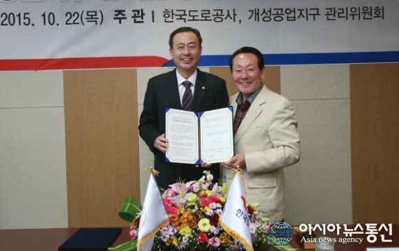 지난 22일 한국도로공사 김학송 사장(오른쪽)과 개성공업지구관리위원회 김남식 위원장(왼쪽)이 개성공업지구 유지관리 기술지원 협약을 체결하고 기념촬영을 하고 있다.(사진제공=한국도로공사) 한국도로공사(사장 김학송.도공)는 최근 개성공업지... 2015-10-27